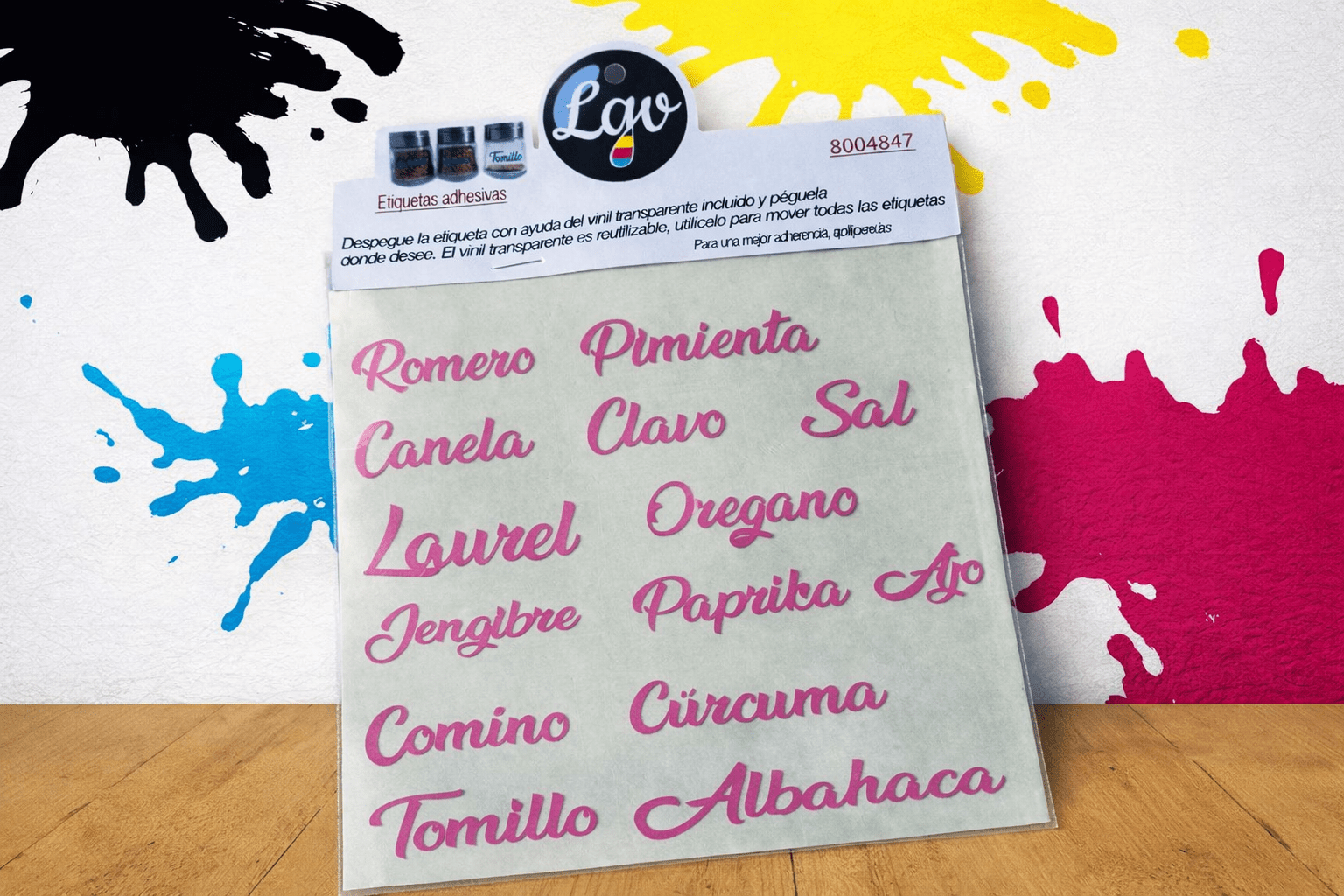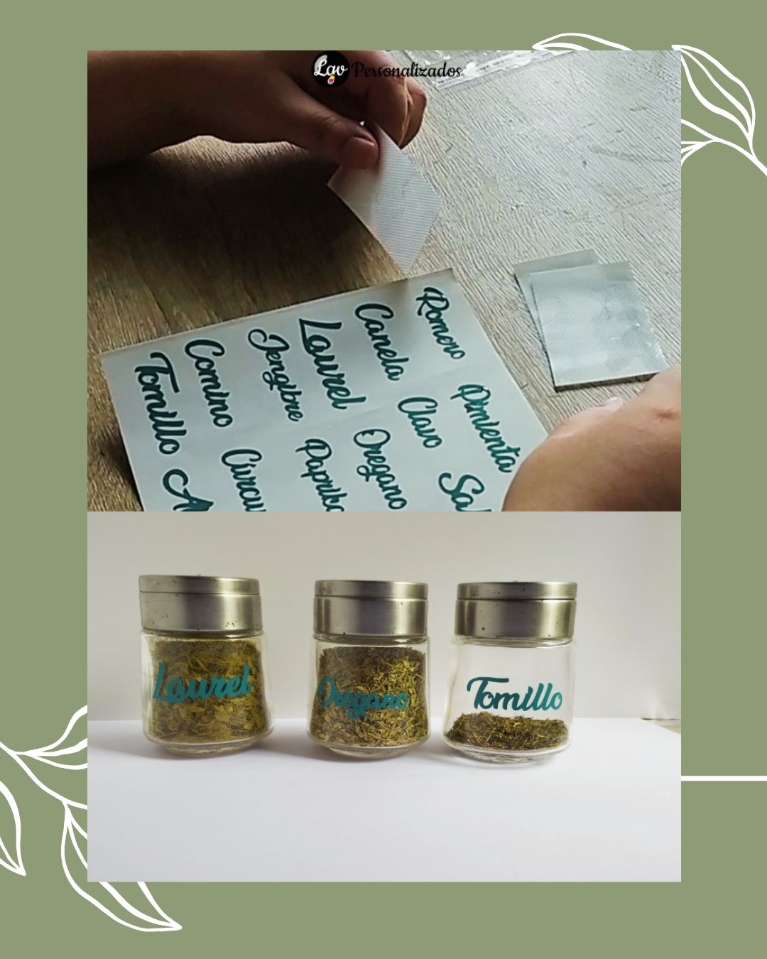 Etiquetas adhesivas de vinilo personalizadas para tus especias favoritas, convierten cada frasco en un detalle elegante y organizado.
